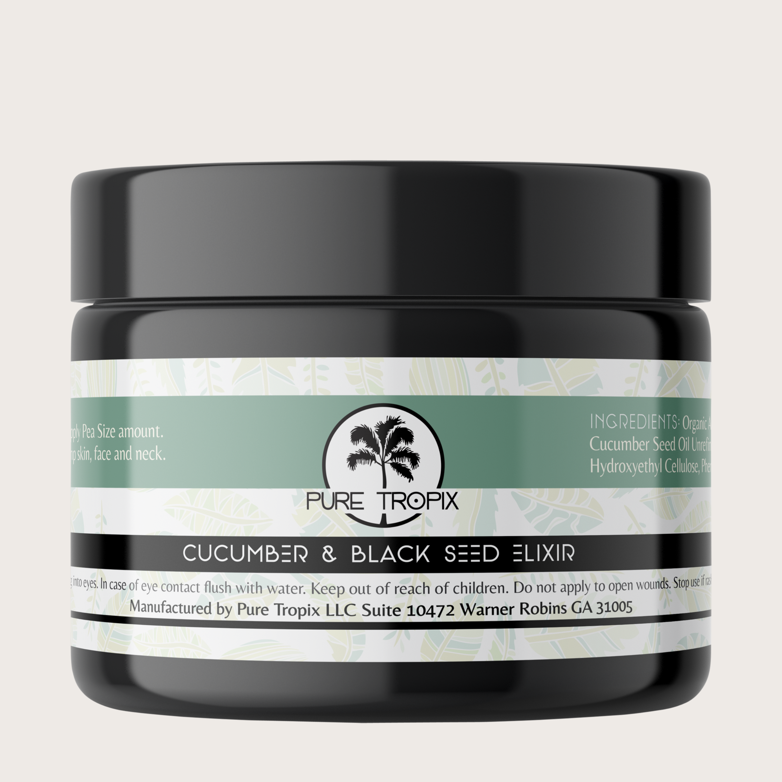 Organic Aloe Leaf Juice (Aloe Barbadensis), Black Seed Oil “Nigella Sativa”, Cucumber Seed Oil Unrefined “Cucumis sativus”, Cupuaçu Butter “Theobroma grandiflorum”, Hydroxyethyl Cellulose, Phenoxyethanol, Tetrasodium Glutamate Diacetate, Bergamont Essential Oil