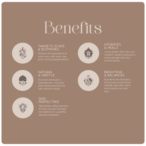 As the lightweight formula absorbs, its powerful ingredients spring into action: Bearberry Extract and Licorice Rootbrighten and fade discoloration, while Cocoa Butter and Aloe Vera deeply hydrate, smoothing rough textures and softening scars. The gentle exfoliating power of Willow Bark Extract clears away dead skin cells, revealing a fresh, radiant layer beneath.