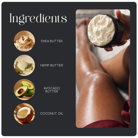 Shea butter, Hemp butter, Mango butter, Coconut Oil, Fragrance Oil (natural)
