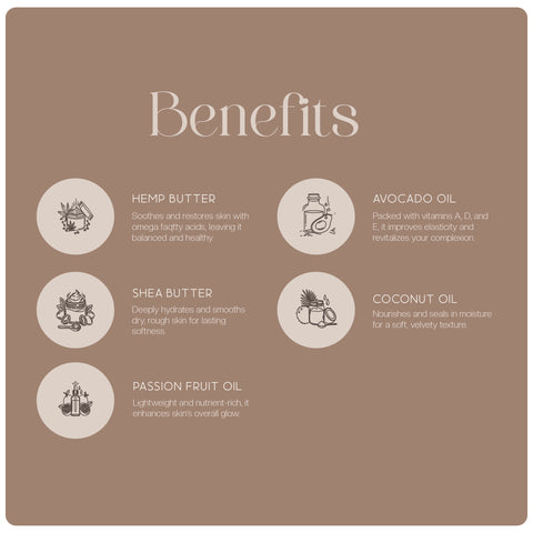 Hemp Butter: Soothes and restores skin with omega fatty acids, leaving it balanced and healthy.