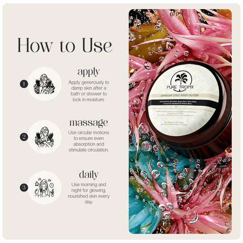 Imagine scooping a cloud-like swirl of Jamaican Gold Extreme Body Butter, its rich texture gliding effortlessly across your skin. As you massage it in, the nourishing blend of butters and oils melts into your body, leaving a radiant glow and a velvety smooth finish.