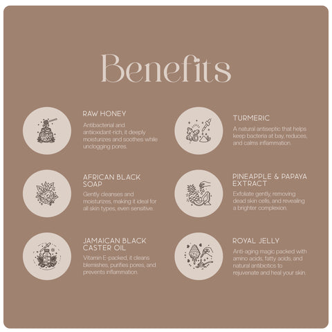 Black Soap, Butyrospermum Parkii (Unrefined Shea Butter),Apple cider vinegar, Vegetable glycerin, Olive oil pomace , Black castor oil, Bentonite Clay, Turmeric Powder, Bromelain powder, Papain powder, Tea Tree Oil, Natural Fragrance Blend, Royal Jelly.